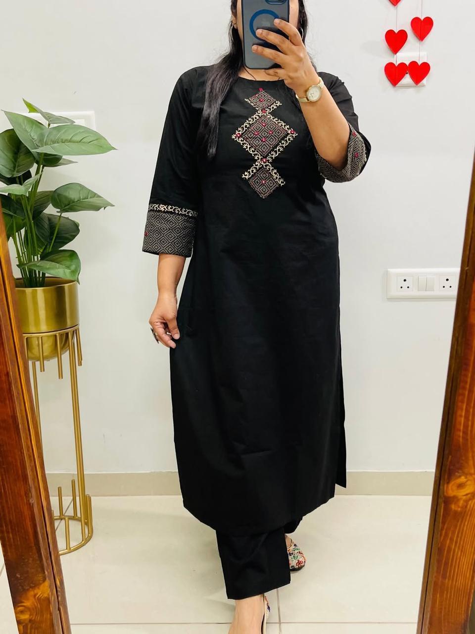 Launching Designer kurta pant set in Aline kurti pattern paired with Ankle length Pant giving perfect outfit and deliberate choice about your look or katha work with mirror 🪞 work on yoke and matching printed border.